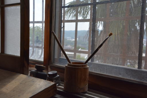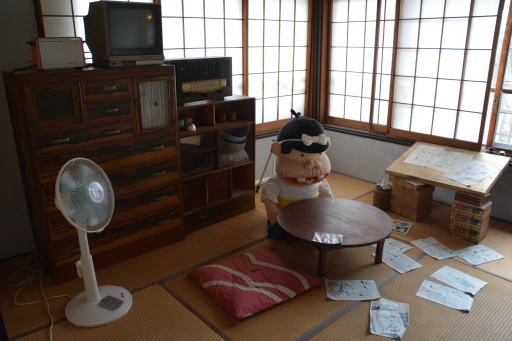 | トキワ荘時代の赤塚不二夫は極貧生活だった為,机が買えずに漫画本を積んだ上に板を置き,片側を窓枠に掛けて机の代わりにしていたそうです。[撮影日:2016年9月17日,機種:D7100] |